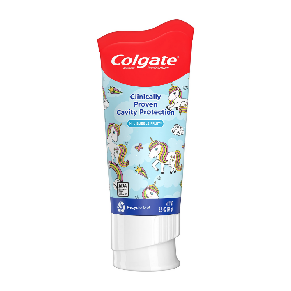 Haz que la hora de cepillarse sea divertida con Colgate Kids Mild Bubble Fruit, la pasta dental con delicioso sabor frutal y diseño de unicornios que encanta a los niños. Su fórmula con flúor ayuda a proteger contra las caries y mantiene los dientes limpios y saludables.